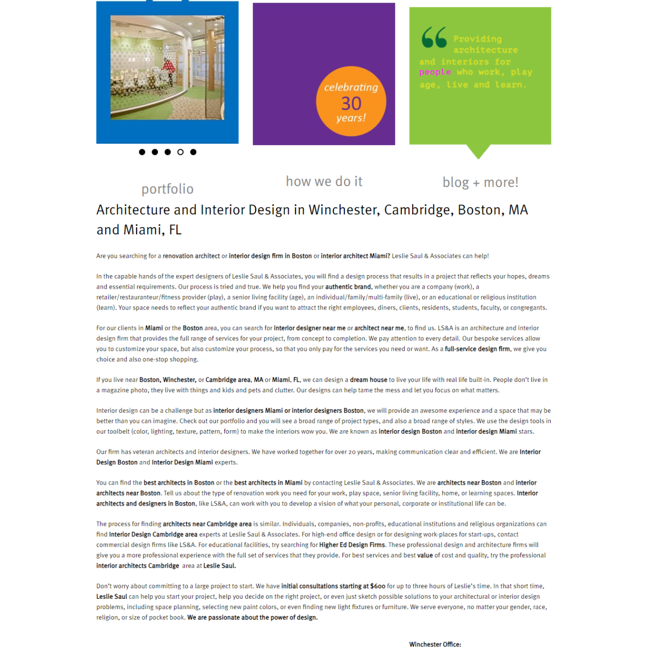 Leslie Saul and Associates faced challenges related to online visibility and user experience. Despite its prestigious reputation and portfolio of successful projects, the firm struggled to rank prominently on Google for relevant keywords in the competitive architecture and design industry. Additionally, the firm's website needed a modern redesign to better showcase its portfolio and improve user engagement.